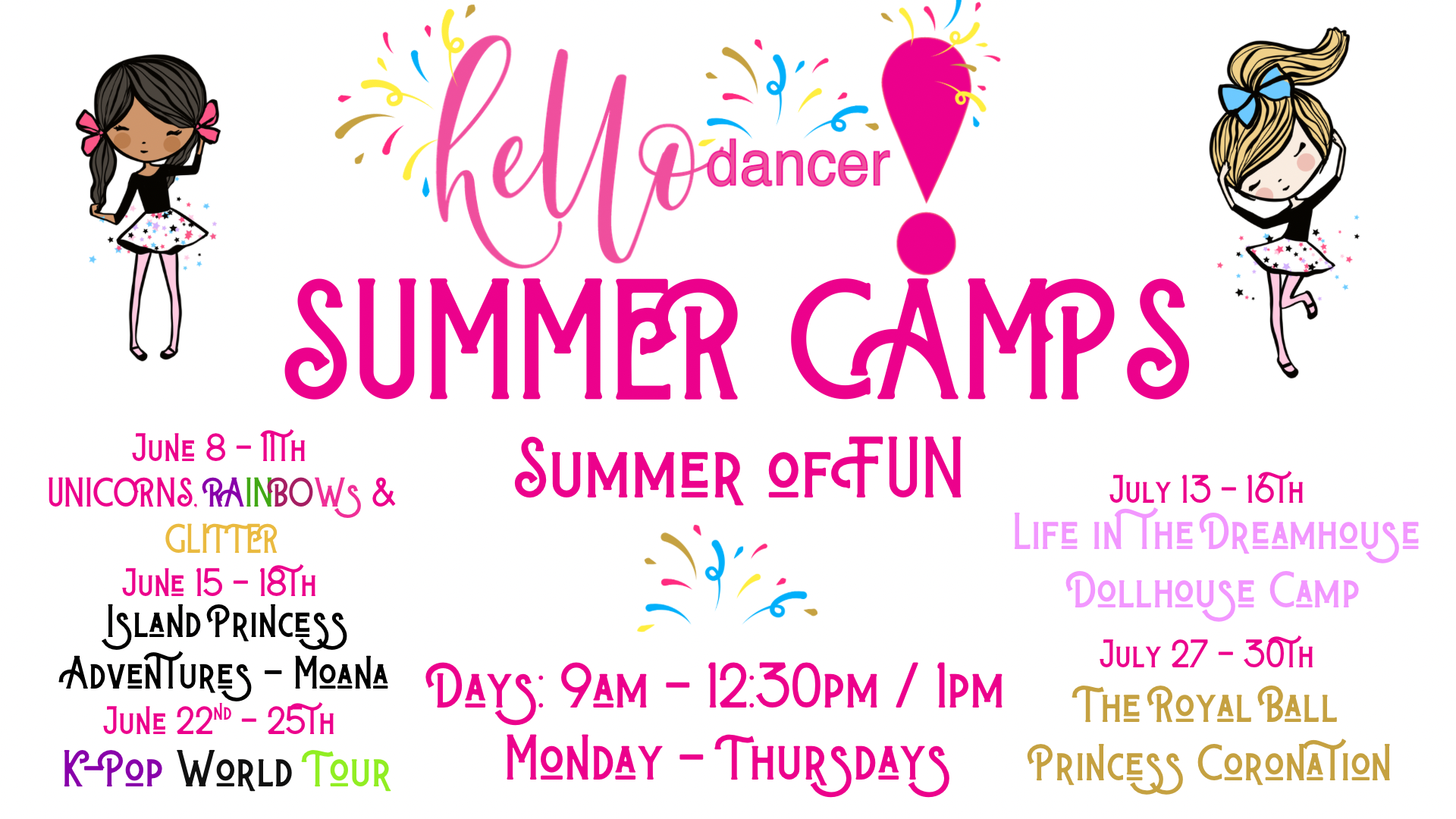 Price: Current Members of Hello Dancer *$275 (9am - 12:30pm) (add extended care $40 till 1pm) / Rates for those not currently with Hello Dancer $325 (9am - 12:30pm) (add extended care $40 till 1pm)